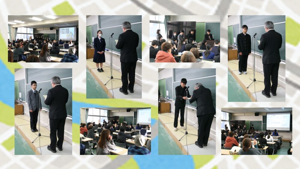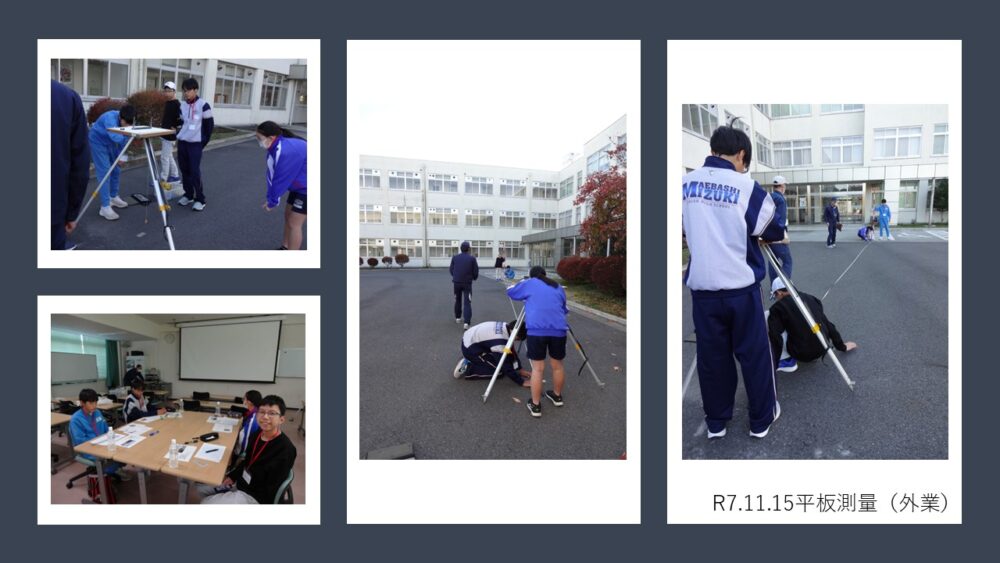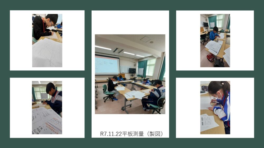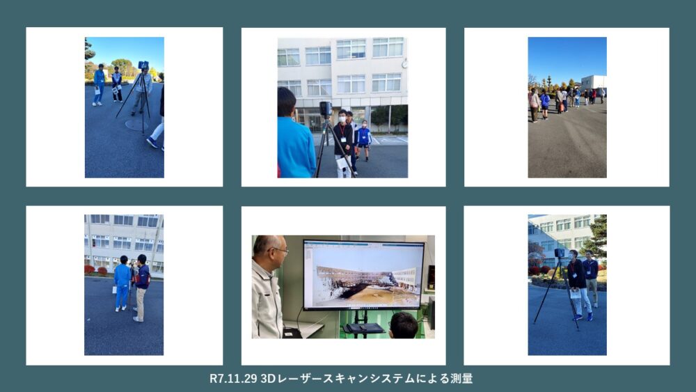令和7年度スマートサイエンススクールにおいて、環境都市工学科のテーマは「地図を作ってみましょう!」でした。このスクールでは、参加された中学生チームが高専の正門ロータリー周辺の地図を作成することを目的としました。まず、日本全土の精密な地図を作った伊能忠敬が使用していた平板測量を用いて、骨組・細部測量を行い、手書きで平面図を作成しました。そして、最新の3Dレーザースキャンシステムを用いて、複数測点で対象物を計測(スキャン)し、取得したスキャンデータを点群データ処理ソフトウェアで編集し、3Dモデルを作成しました。また、ドローンの飛行に関する法規制に準じて、ドローンによる撮影を行い、過去に取得したデータを用いて写真3D計測(測量)システムによる測量について学びました。閉校式では、参加された皆さんが自ら作成したスライドで素晴らしい発表を行いました。